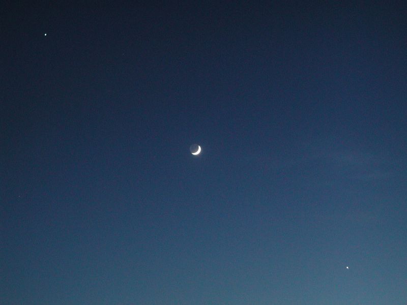 Beide Aufnahmen zeigen die Mondsichel, wie sie am 15.5.2002 um 22 Uhr zwischen Jupiter (links) und Venus stand.