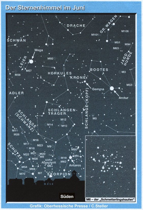 Die kurzen Juninächte lassen die Beobachtung von Sternen erst sehr spät zu. Als erste Sterne in der Dämmerung findet man den orangefarbenen Arctur im Bootes und die bläuliche Wega in der Leier. Nach und nach erscheinen immer mehr Sterne und nach Einbruch der Dunkelheit kann man sich mittels Fernglas oder Teleskop auf die Suche nach Sternhaufen begeben. Nebenstehende Karte zeigt die auffälligsten dieser Gebilde, die im Juni besonders nahe des Horizontes recht häufig sind. Zur Beobachtung horizontnaher Objekte sollte die Luft allerdings ziemlich transparent sein, was zumeist nach dem Durchzug einer Kaltfront der Fall ist. Ein bemerkenswerter offener Sternhaufen ist M6 [siehe Ausschnitt], der im Fernglas als mit Sternen durchsetzter Nebelfleck wirkt, sich aber bereits im kleinen Teleskop als Sternhaufen in Form eines Schmetterlings entpuppt der von Astronomen auch liebevoll "Schmetterlingshaufen" genannt wird.