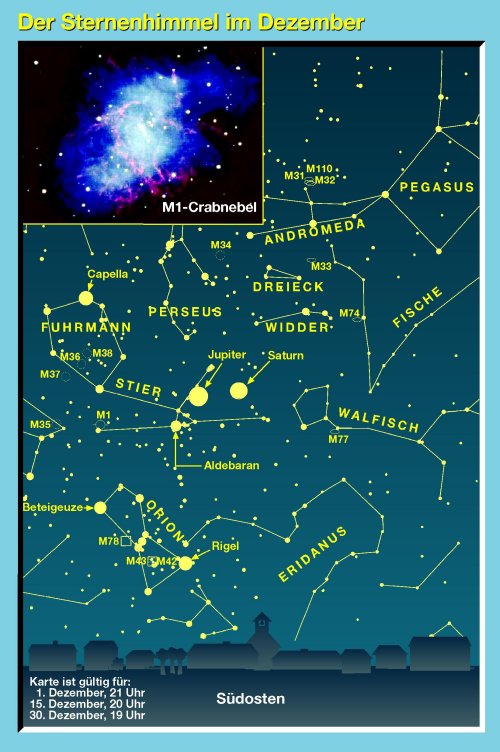 Der Fixsternhimmel im Dezember zeigt sich im östlichen Bereich frühwinterlich. In südöstlicher Richtung erkennt man am frühen Abend die typischen Wintersternbilder Stier, Fuhrmann und Orion, die Zwillinge und die beiden Hunde folgen im Laufe der Nacht.