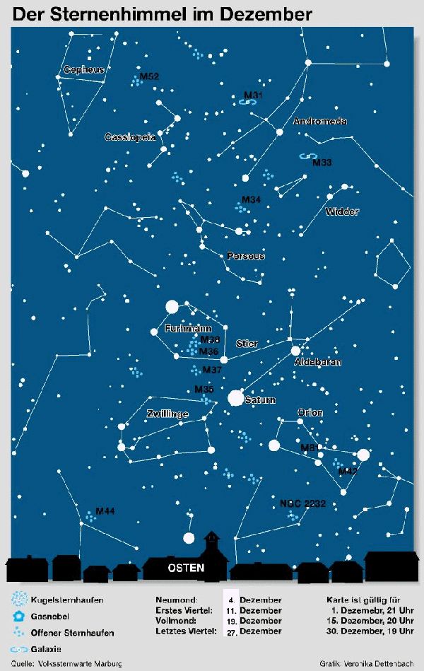 Im Dezember können typische Wintersternbilder wie Orion, Fuhrmann und Zwillinge gesehen werden, die zu Beginn der Dunkelheit am östlichen Horizont erscheinen.