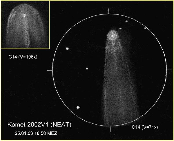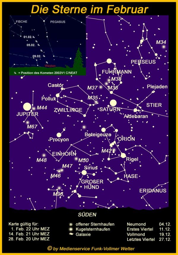Am 6. November 2002 wurde mit dem NEAT (Near Earth Asteroid Tracking)-Teleskop auf Hawaii im Sternbild Stier ein neuer Komet entdeckt, der die Bezeichnung C/2002V1(NEAT) erhielt. Am 18. Febr. wird er die Sonne in weniger als 15 Mio. km umrunden. Ob er diese Passage heil überstehen wird, ist sehr ungewiss. Da Kometenkerne zum großen Teil aus Eis bestehen, ist es durchaus möglich, dass sich der Komet bereits vorher auflöst. Eine Helligkeitsprognose ist schwierig, möglicherweise wird C/2002V1in der ersten Monatsdekade ein auffälliges Objekt am westlichen Abendhimmel [Einsatz in Karte]. Sollte er seine jetzige Helligkeitsentwicklung beibehalten und unbeschadet die Sonne umrunden, könnte er sogar um den 18. am Taghimmel neben der Sonne zu sehen sein. VORSICHT! Nicht in die Sonne schauen.
