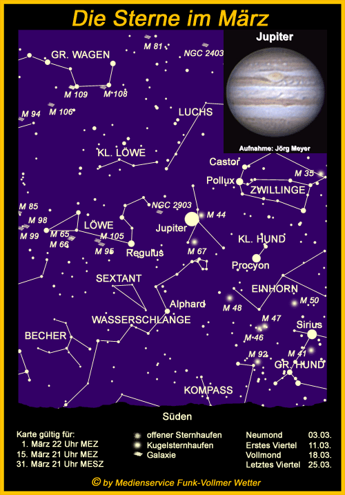 Noch gut am Abendhimmel platziert ist Saturn, er zählt auch im März zu den reizvollsten Bebachtungsobjekten bei einem Besuch auf einer Sternwarte. Strahlendstes Gestirn am Nachthimmel ist Jupiter , der größte Planet des Sonnensystems. Bereits in der Dämmerung kann man den strahlenden Jupiter in östlicher Richtung erblicken. Mit zunehmender Dunkelheit und Höhe steigert sich die Leuchtkraft dieses Riesenplaneten, der den Durchmesser der Erde um das 11-fache übertrifft. Bei ruhiger Luft lassen sich, in einem guten Amateurteleskop oder in einem leistungsstarken Fernrohr einer Sternwarte, neben den dunklen Bändern mancherlei Strukturen in Jupiters Atmosphäre erkennen. Das bekannteste Detail ist der große rote Fleck [Einsatz in Karte], ein gigantischer Wirbelsturm auf Jupiter, der seit mehr als hundert Jahren existiert, in den letzten Jahren jedoch eher orange erscheint. Dieser Sturm ist wirklich monströs sowohl in Punkto Ausdehnung als auch in Bezug auf seine Windgeschwindigkeiten. Die Erde könnte man bequem in dem 22.000 km langen Wirbel platzieren und irdische Hurrikans mit Spitzengeschwindigkeiten von 280 km/h wären dort ein laues Lüftchen neben der mit bis zu 600 Stundenkilometer tobenden Jupiteratmosphäre. Jupiter dreht sich in weniger als 10 Stunden um seine Achse, als Folge ist der Planet durch die daraus resultierenden Zentrifugalkräfte merklich abgeplattet. Mars und Venus sind im April am Morgenhimmel zu finden, sind aber keine lohnenswerte Beobachtungsobjekte.