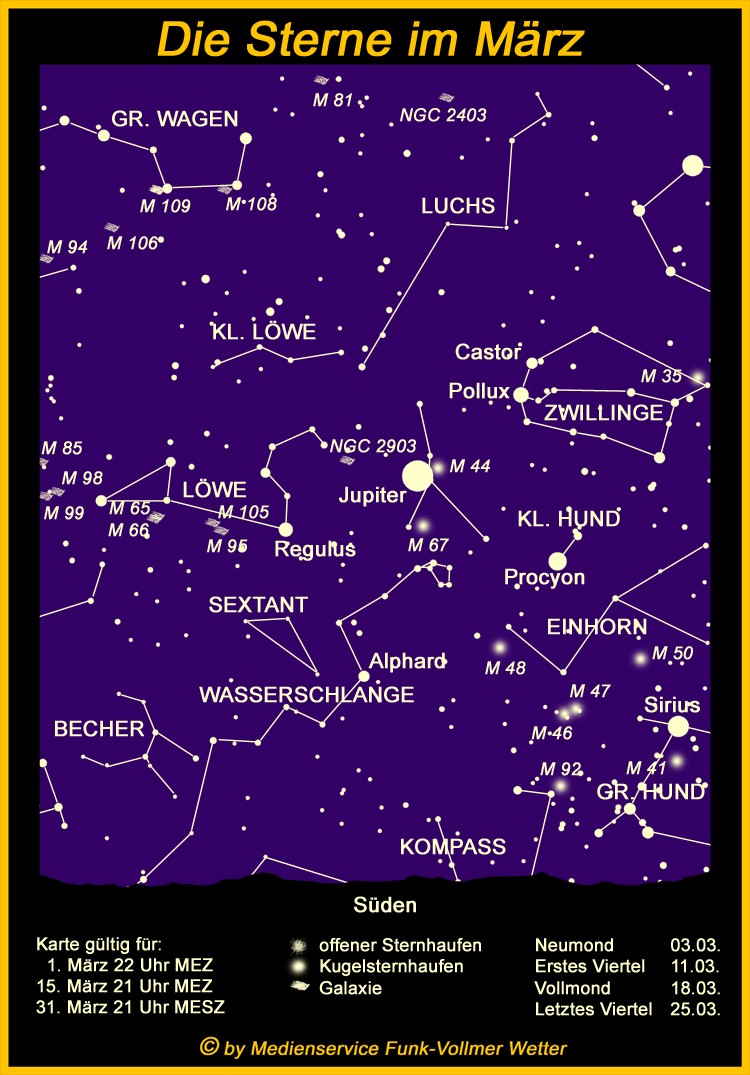 Auch am abendlichen Sternhimmel kann man erkennen, dass der Lenz Einzug hält. Auf nebenstehender Sternkarte wird sichtbar, dass die Wintersternbilder wie, Zwillinge, Einhorn und Großer Hund vor den nachfolgenden Frühlingssternbildern wie Krebs, Löwe und Wasserschlange das Feld räumen; im Lauf der Nacht werden sie unter den westlichen Horizont sinken. Mit den Frühlingssternbildern erscheinen auch wieder Galaxien am Abendhimmel. Zu den hellsten zählen die nach dem französischen Astronomen Charles Messier benannten M-Objekte wie z.B. M65. Zwei helle Galaxien, die schon in einem 7x50 Feldstecher beobachtbar sind, hat Messier jedoch übersehen. Erst im New General Cataloque (NGC) werden die hellen Galaxien NGC 2403 und NGC 2903 aufgeführt.