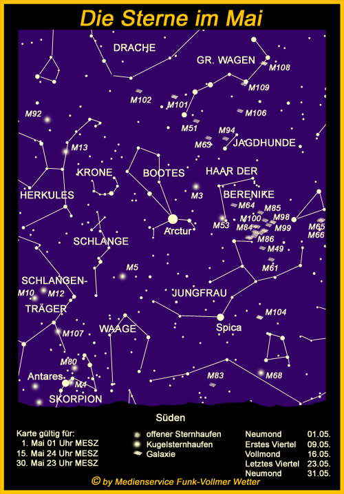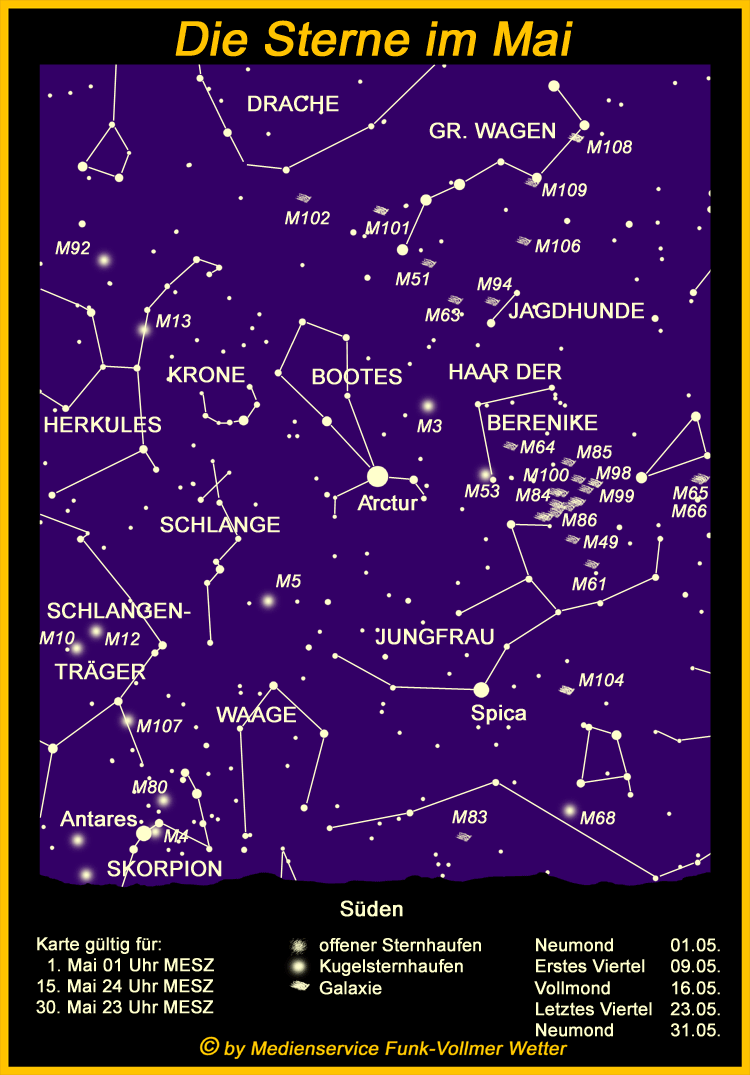 Am Fixsternhimmel haben sich nun alle Frühlingssternbilder fest etabliert. Das bekannte Sternbild des Großen Wagens kann leicht zur Orientierung verwendet werden, seine Deichsel zeigt in Richtung des hellen Sternes Arctur. Besitzer von Ferngläsern oder kleinen Teleskopen sei ein Blick zu den hellen Kugelsternhaufen wie M3, M5 oder M13 empfohlen, die sich in einem kleinen Instrument als verwaschene Nebelfleckchen zeigen und sich in einem leistungsstarken Amateur- oder Sternwartenteleskop ihre wahre Natur offenbaren.