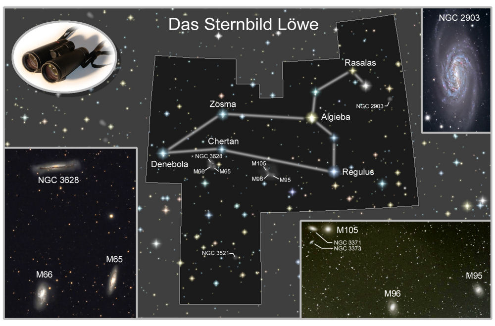 Ein Blick auf nebenstehende Sternkarte zeigt allesamt Frühlingssternbilder, besonders in den Sternbildern Großer Wagen, Jagdhunde, Haar der Berenike, Jungfrau und Löwe lassen sich zahlreiche Galaxien auffinden. Besonders einige prachtvolle Exemplare im Sternbild des Löwen (sie Zusatzgrafik) sollen heute vorgestellt werden. Der hellste Stern im Löwe (lateinisch: Leo), ist der 77 Lichtjahre (LJ) entfernte Regulus, dessen Name Kleiner König bedeutet. Algieba (Mähne des Löwen, 126 LJ entfernt) ist ein schöner Doppelstern, bereits in einem kleinen Teleskop erkennt man zwei goldgelbe Riesensterne, die sich gegenseitig umkreisen, allerdings dauert ein Umlauf etwa 600 Jahre. Bereits diese beiden Sternen befinden sich mit ihren 77 bzw. 126 Lichtjahren Entfernung in einer für uns unvorstellbaren Entfernung (bekanntlich legt das Licht in einer Sekunde ca. 300.000 km (7,5x um den Äquator der Erde) zurück, in einem Jahr sind das 9,5 BILLIONEN Kilometer), doch stehen sie noch nahe im Vergleich zu den Galaxien - diesen eigenständigen Milchstraßensystemen in bis zu 50 Millionen LJ (mehr als HUNDERTTRILLIONEN Kilometer) Entfernung. Galaxien zeigen auf lang belichteten Aufnahmen meist einen hellen Kern und zarte Spiralarme die zum Teil von dunklen Staubmassen durchsetzt sind. Besucher einer Volkssternwarte dürfen nicht erwarten solch beeindruckende Anblicke "live" im Teleskop zu erleben, meist zeigt sich ein solch weit entferntes Milchstraßensystem "nur" als zartes Lichtwölkchen - nur in sehr dunklen Regionen können in größeren Amateurteleskopen Details erkannt werden. Einen wunderbaren Anblick bietet das Galaxientrio M65, M66 und NGC 3628 - auch Leo`s-Triplett genannt, wenn die drei Galaxien gemeinsam im Gesichtsfeld eines Teleskops stehen. Unter dunklen Bedingungen können bei M65 und NGC 3628 die Staubbänder auch visuell wahrgenommen werden. Beeindruckend ist auch das Trio von M95, M96 und M105 - die Beobachtung der Galaxien NGC 3371 NGC 3373 bleibt Beobachtern mit größeren Instrumenten vorbehalten. Im Zentrum von M105 befindet sich nach Berechnungen von Astronomen ein gewaltiges Schwarzes Loch mit circa 50 Millionen Sonnenmassen, das alles wie ein gigantischer kosmischer Staubsauger in sich einsaugt, was ihm zu nahe kommt. Der Begriff "Schwarzes Loch" wurde 1967 von John A. Wheeler geprägt und verweist auf den Umstand, dass es sich um eine Krümmungssingularität (Singularität = Gegebenheiten, unter denen physikalische Gesetze nicht definiert sind) der Raumzeit handelt ("Loch") und dass selbst sichtbares Licht, diesen Bereich nicht verlassen kann und es einem menschlichen Auge daher vollkommen schwarz erscheinen würde. Auch die Spiralgalaxie NGC 2903 ist bei dunklem Himmel in einem kleinen Instrument sichtbar.