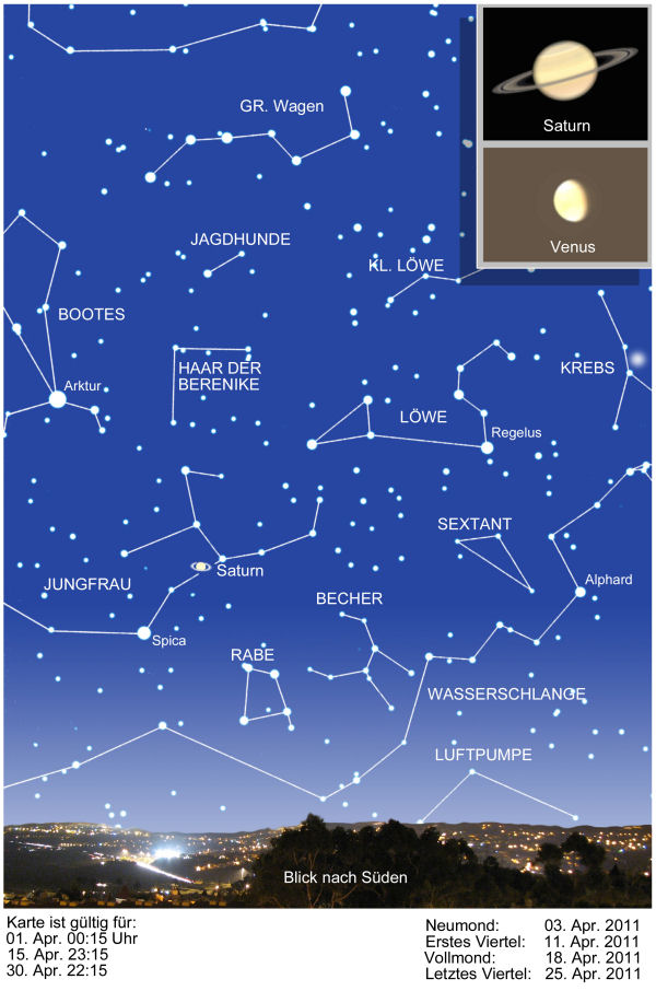 Bevor ich die Leser in die Tiefen des Weltalls entführe, richtet sich unser Blick auf unser Sonnensystem. Gleich zu Beginn der Dunkelheit (zum Monatsbeginn ca. 21 Uhr, am Monatsende gegen 22 Uhr Sommerzeit) zeigt sich über dem südöstlichen Horizont ein helles, aber nicht strahlendes Gestirn (siehe Sternkarte). Schaut man durch ein10-fach vergrößerndes Fernglas erkennt man, dass dieses Objekt nicht punktförmig, wie ein Fixstern erscheint, sondern etwas in die Länge gezogen ist. Der Blick durch ein kleines Teleskop enthüllt auf Anhieb die Identität des Objekts, ein Planetenscheibchen umgeben von Ringen: wir sehen Saturn, den schönsten aller Planeten. In der Nacht vom 3. zum 4. April steht Saturn der Sonne genau gegenüber - Astronomen sagen, Saturn steht in Opposition zur Sonne - das heißt, dass der Ringplanet mit Sonnenuntergang aufgeht und bei Sonnenaufgang untergeht. Somit besteht in diesem Monat die beste Beobachtungsmöglichkeit dieses Planeten. Wie schon erwähnt, zeigen sich die Saturnringe in einem kleinen Fernrohr, mit zunehmender Größe eines Teleskops verbessert sich die Wahrnehmung an Details. Mit größeren Amateurteleskopen oder an Volkssternwarten, kann man erkennen, dass es sich nicht um einen einzelnen Ring handelt, sondern dass dieser durch so genannte Teilungen unterbrochen ist. Die Oberfläche von Saturn selbst ist recht homogen, einige sehr zarte Bänder können gesehen werden. Doch ist die Saturnoberfläche nicht immer so "langweilig", in den vergangenen Wochen tobte in Saturnatmosphäre ein Sturm, der auch mit kleineren Teleskopen zu beobachten war. Fünf der 61 bekannten Saturnmonde sind in Amateurteleskopen sichtbar, Titan der größte Saturnmond kann sogar mit einem Fernglas gesichtet werden. Nur noch ein weiterer Planet unseres Sonnensystems kann man im April sehen, es ist Venus, die kurz vor Sonnenaufgang knapp über dem östlichen Horizont erscheint, aber wenig auffällig ist.