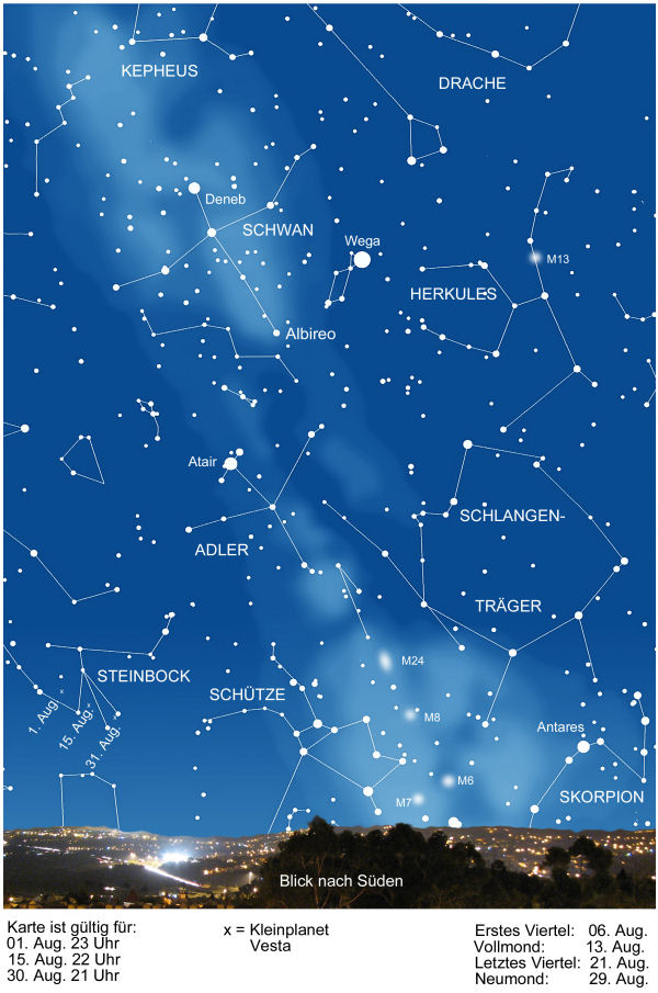 Mit zunehmender Dunkelheit erscheinen immer mehr Sterne am Firmament, zuerst die hellsten wie Wega in der Leier, Deneb im Schwan und Atair im Adler (siehe Sternkarte). Diese drei Sterne bilden das bekannte Sommerdreieck, das aber kein Sternbild darstellt. Nach und nach erscheinen nun auch schwächere Sterne und nach dem Ende der Dämmerung zeigt sich in der mondlosen Zeit zum Monatsbeginn und der letzten Monatdekade auch die Milchstraße. Wie viel Sterne zu sehen sind und wie deutlich die Milchstraße zu erkennen ist, hängt von der Dunkelheit des Standortes ab. In Zentren von Städten wird man die Milchstraße vergeblich suchen, aber auch an deren Rändern ist sie nur verschwommen zu erkennen. Unter guten ländlichen Bedingungen mit geringer Lichtverschmutzung erscheint das Band der Milchstraße jedoch strukturiert und helle und dunkle Bereiche sowie Dunkelwolken sind leicht sichtbar. Besonders im Sternbild Schwan - das auch als Kreuz des Nordens bezeichnet wird - ist dies bereits gut mit dem bloßen Auge zu erkennen. In diesem auffälligen Sternbild gibt es aber noch mehr zu entdecken, wie Deneb (=Schwanz) oder den wunderschönen Doppelstern Albireo (=Schnabel). Schon in einem kleinen Teleskop erkennt man die beiden Doppelsternkomponenten, die hellere leuchtet orange und die schwächere türkis.