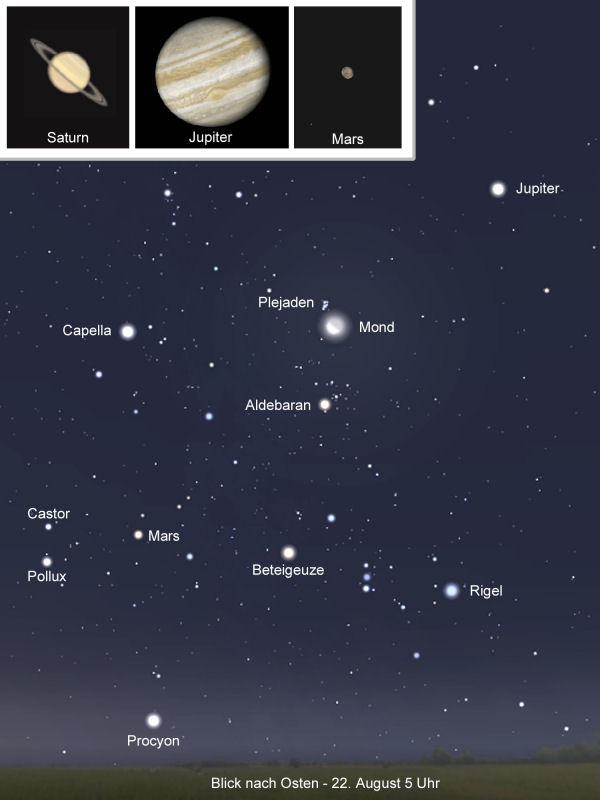 Doch eines wird dem Beobachter in einer klaren und lauen Sommernacht auffallen; es huschen wieder mehr Sternschnuppen als in den Monaten zuvor über den Himmel. Die meisten von ihnen scheinen ihren Ursprung im Sternbild Perseus zu haben, das man in Augustabenden über dem nordöstlichen Horizont findet. Aus diesem Grunde nennt man diese Sternschnuppen auch Perseiden. Die meisten dürften in den Nächten zwischen dem 10. und 14. August sichtbar sein. Leider stört das helle Mondlicht die Beobachtung, so dass nur hellere Perseiden zu sehen sein werden, die in diesem Meteorstrom jedoch reichlich vorhanden sind. Da ihr Erscheinen mit dem Namenstag des Märtyrers Laurentius (10. August) zusammenfällt, werden sie im Volksmund auch die Tränen des Laurentius genannt. Die Perseiden bestehen aus den Auflösungsprodukten des Kometen 109P/Swift-Tuttle, dessen Bahn die Erde immer um den 12. August kreuzt. Perseiden können von Mitte Juli bis Ende August beobachtet werden. Die Zusatzgrafik zeigt den reizvollen Himmelsanblick in der letzten Augustdekade, wo der Mond den Planeten Jupiter (20.Aug.) und Mars (25. Aug.) begegnet, die beide am Morgenhimmel beobachtet werden können. Der Ringplanet Saturn ist in der ersten Augusthälfte noch knapp über dem west-südwestlichen Horizont in der Abenddämmerung zu erhaschen.