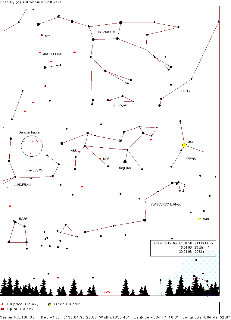 Die beste Zeit um die Sternbilder der nebenstehenden Karte zu beobachten ist die Zeit ab dem 15. April. Im Süden steht in mittlerer Höhe das markante Sternbild Löwe mit dem hellen Stern Regulus, was auf deutsch soviel wie kleiner König bedeutet. Bemerkenswert ist, daß wir das bekannte Sternbild Großer Wagen im Frühjahr abends im Zenit (direkt über dem Beobachter) finden. Die Sternbilder Jagdhunde, Luchs, Kl. Löwe und Krebs sind nicht allzu ausgeprägt, da sie nur aus schwächeren Sternen gebildet werden. Auffälliger sind wieder die Sternbilder Wasserschlange und Rabe unterhalb von Löwe und Jungfrau.