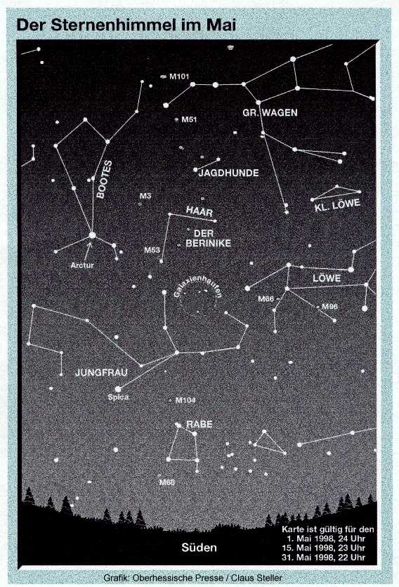Die zweite Maihälfte, wenn kein Mondlicht die abendliche Beobachtung stört, eignet sich zur Beobachtung von Sternbildern, Sternhaufen und Galaxien. Ihre günstigste Stellung am Abendhimmel erreichen im Mai die Sternbilder [Karte] Gr. Wagen auch Gr. Bär genannt, Bootes mit dem glänzenden Stern Arctur - dessen Name so viel wie Bärenhüter bedeutet, da er stets dem Gr. Bären folgt , Jagdhunde, Haar der Berinike, Jungfrau mit der hellen Spica und der Rabe.