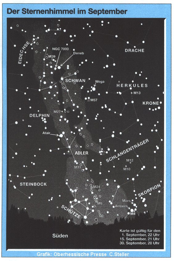 Der abendliche Fixsternhimmel wird nach wie vor von den Sommersternbildern dominiert, auch die hellsten Partien der Milchstraße sind im September noch gut zu beobachten. Ein Blick in südliche Richtung [siehe Karte] zeigt über dem Horizont die Sternbilder Skorpion mit dem rötlichen Antares - der allerdings leicht mit dem etwas helleren Mars, der in diesem Monat ebenfalls im Skorpion zu finden ist, verwechselt werden kann - Schütze und Steinbock. Etwas oberhalb stehen die Sternbilder Schlangenträger, Adler mit dem auffälligen Stern Atair und der Delphin. Markant sind die Sternbilder Schwan mit dem Hauptstern Deneb sowie die Leier mit der strahlenden Wega. Aus weniger hellen Sternen werden die Konstellationen Herkules und Drache gebildet.